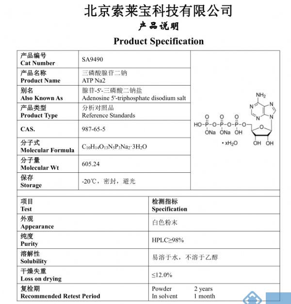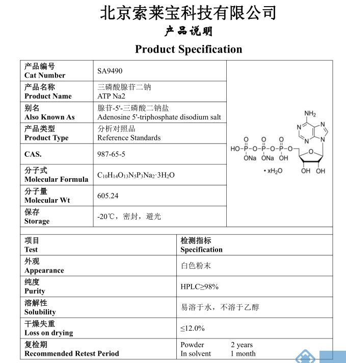 产品名称: ATPNa2;三磷酸腺苷二钠